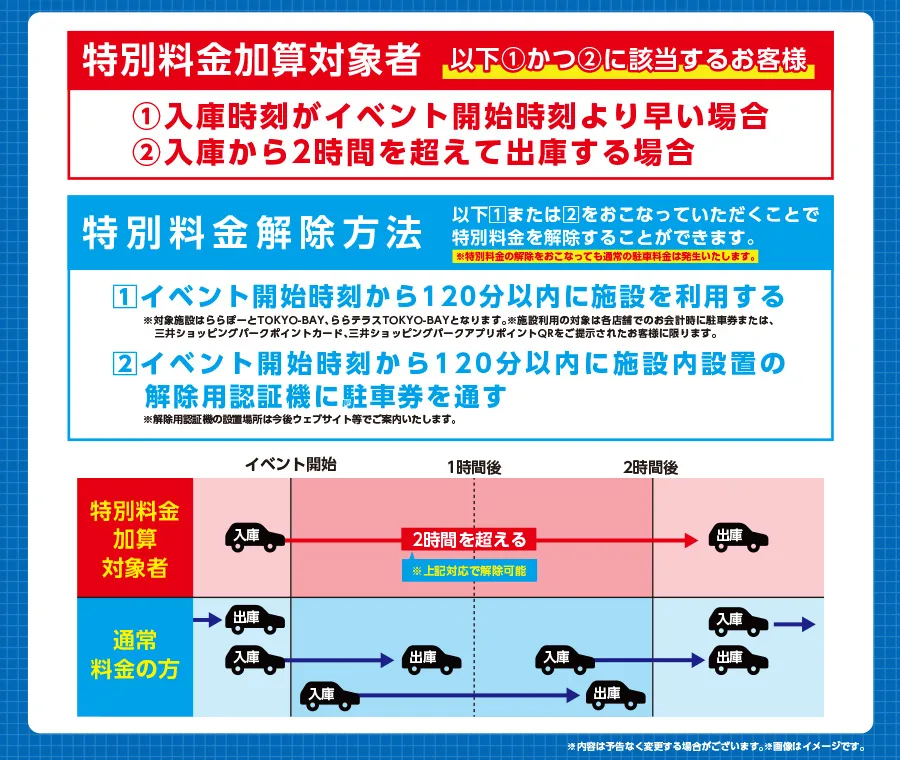 これは、イベント参加者がららぽーと TOKYO-BAYの駐車場を集中的に利用することを避けるための措置だ。このように、三井不動産グループのショッピング・イベント施設の駐車場を利用する際の注意点として覚えておこう。