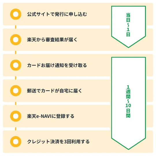 ここまでの内容で、「楽天カードの審査に向けて準備ができた」と思えた人は、さっそく楽天カードの発行に申し込んでみよう。申し込み・審査・発行までは以下のように進む。
