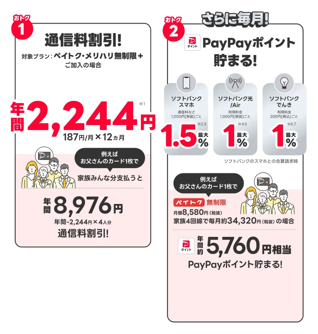 一方のPayPayカードは、ソフトバンクユーザーが通信料割引を受けられ、通信料の支払いで1.5%ポイント還元される。