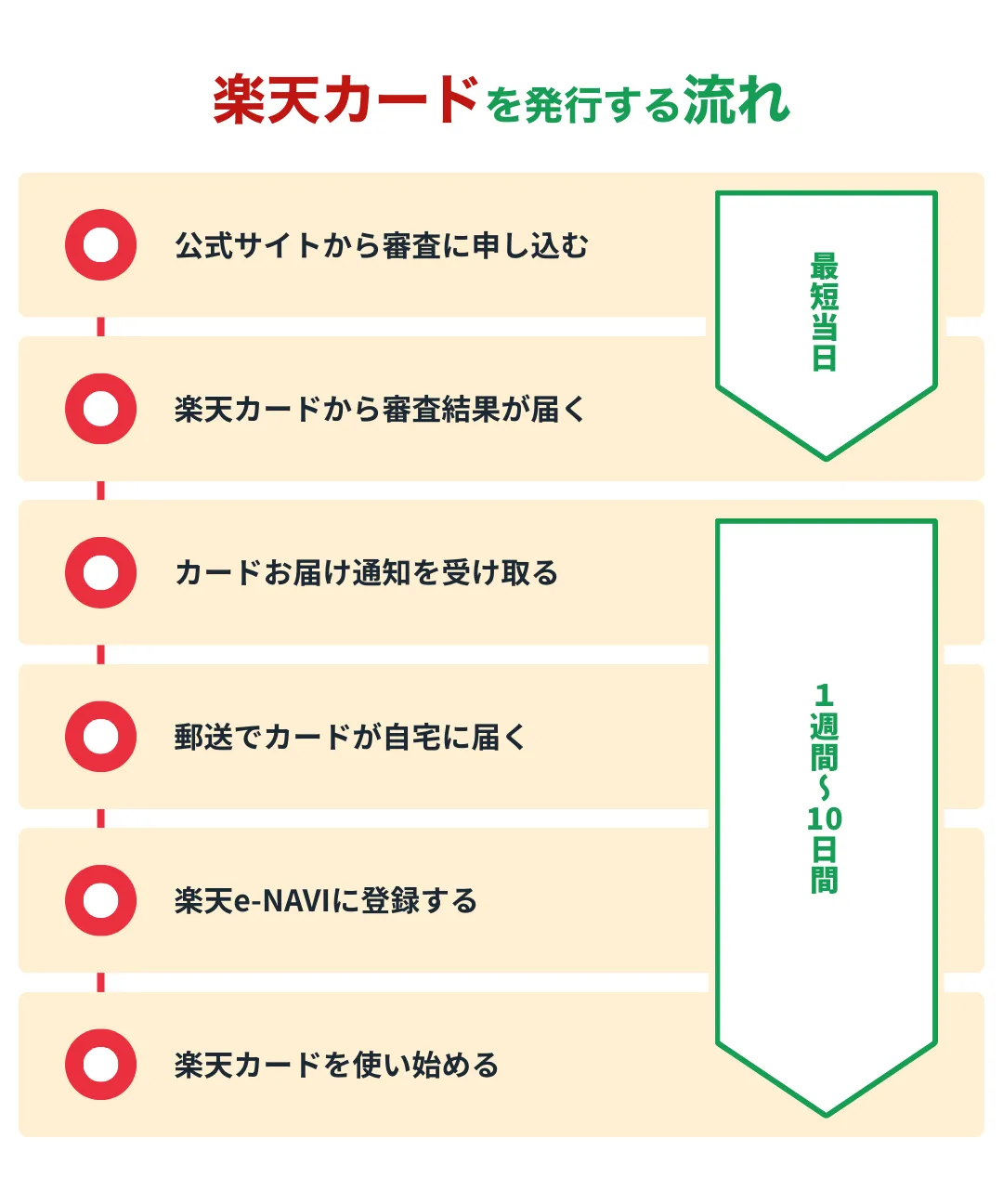 「できる限り早くクレジット決済を使いたい」という人にとって重要なポイントが、クレジットカードの発行スピードだ。楽天カードの場合、申し込みから最短当日中に審査が完了し、1週間程度でカードが自宅に届く。