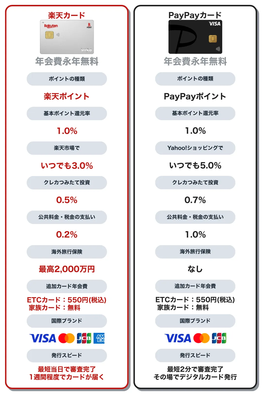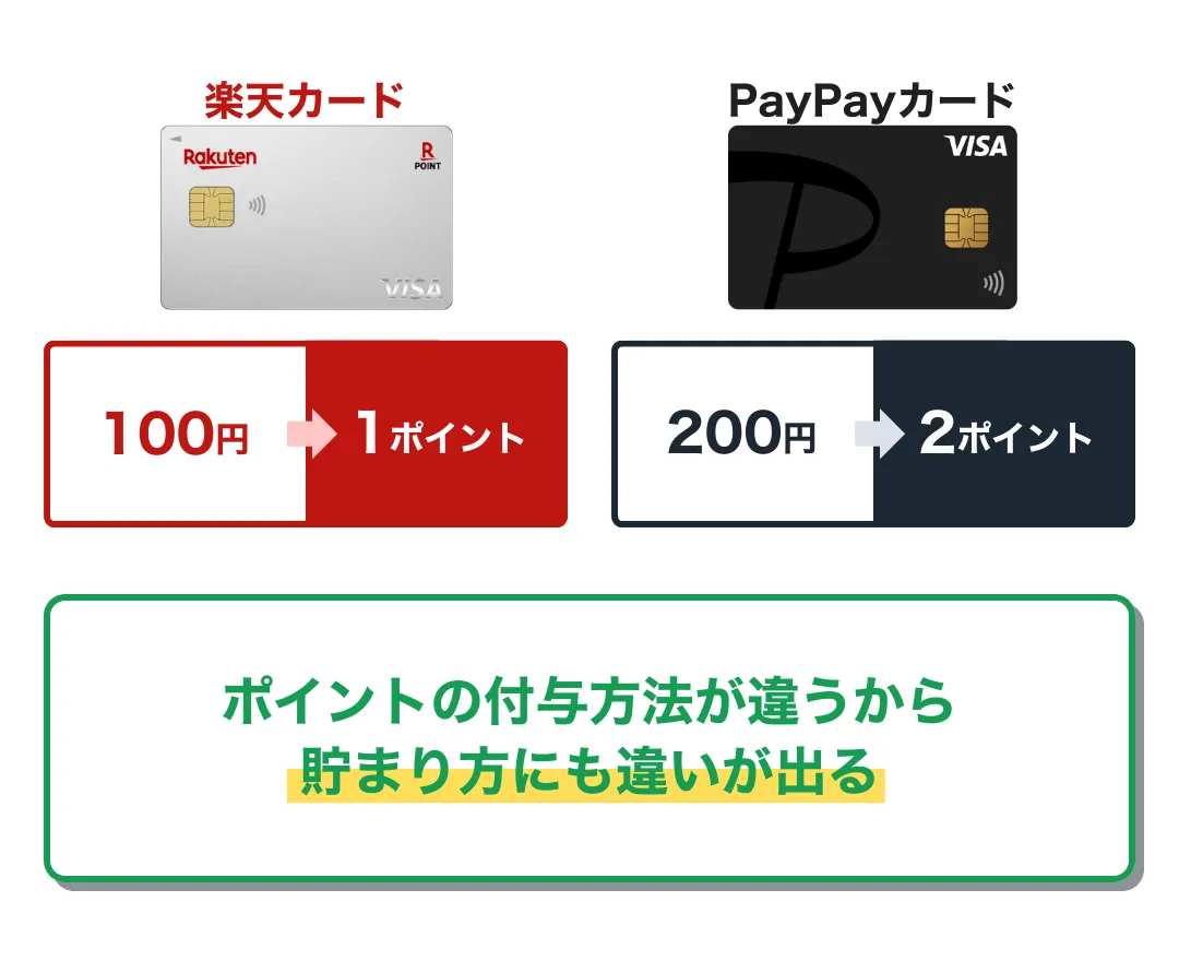 ここからは、楽天カードとPayPayカードの違いをテーマごとに比較していく。