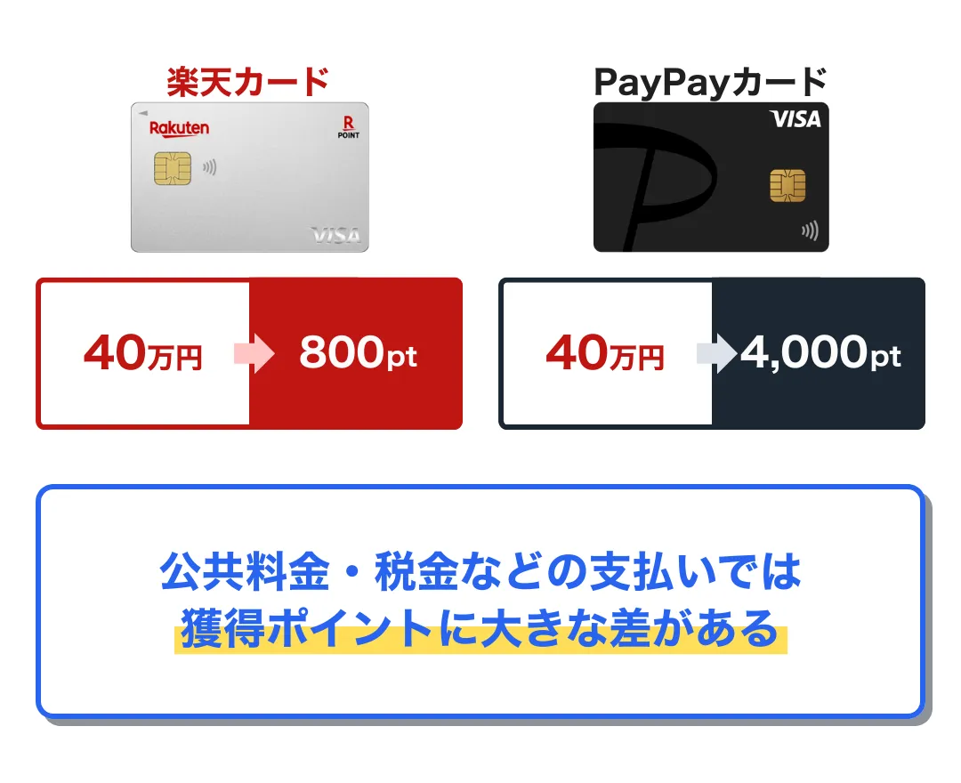 一方で、楽天カードは公共料金や税金などの支払いでも楽天ポイントを獲得できるが、ポイント還元率は0.2%と大幅に下がる。仮に公共料金や税金などの支払いが年間40万円の場合、獲得できるポイントはPayPayカードで4,000ポイント、楽天カードで800ポイントとなる。